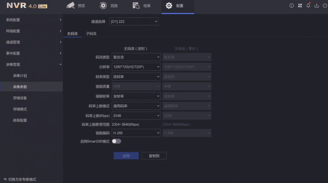 录像码流:设置存储录像时的码流参数信息。可选择选项:主码流、子码流,默认主码流录像。